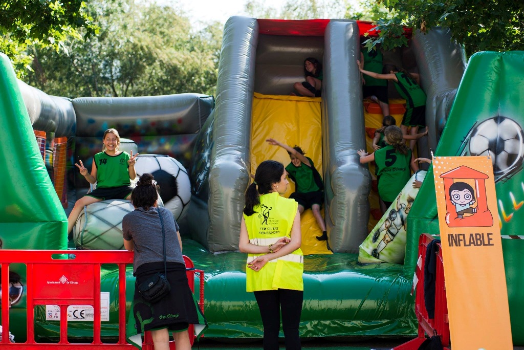Pista americana decorat amb elements de futbol on gaudirant saltant i baixant pel tobogan.